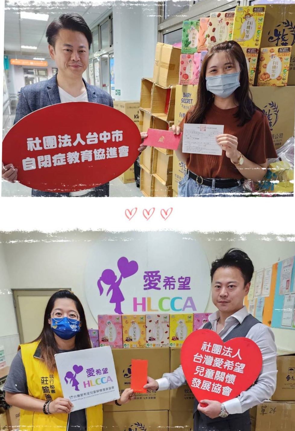 ▲ 圖上:牧菓國際創辦人黃士旗與社團法人台中市自閉症教育協進會,圖下:牧菓國際創辦人黃士旗與社團法人台灣愛希望兒童關懷發展協會。(圖/牧菓國際提供)