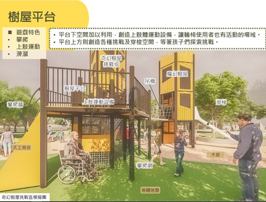 工務局說明,該工程擇定約6000平方公尺作為遊戲場範圍,滿足不同年齡、不同能力兒童遊戲需求,遊戲場內容包括四大主題遊戲場,適合2至12歲的秘密樹屋探索區及水樹遊戲島、5至12歲的奇幻樹屋探險區、13歲以上的森林冒險挑戰區。遊戲設施包含沙坑、秘密小屋、多功能挑戰遊戲塔、鞦韆、水道遊戲、挑戰攀爬網、多功能挑戰路徑、蹦床、上肢旋轉設備。