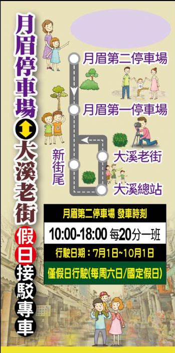 交通局表示,大溪為桃市觀光重鎮,吸引眾多人潮,但因大溪老街位於大溪老城區內,街道較為狹窄,停車空間有限,每到假日停車位經常一位難求,且停車場時常因場內客滿,車輛沿著街道排隊,導致車輛回堵至道路,已對當地交通產生重大衝擊,又大溪老城區自今年4月1日起擴大假日交通管制範圍,停車空間更為稀少,為解決此問題,故交通局開闢「月眉停車場-大溪老街」假日免費接駁專車,鼓勵民眾將車輛停放於停車空間較多的月眉停車場,再搭乘接駁車進入老城區遊玩。