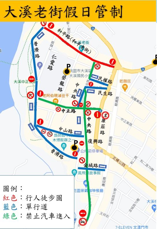 大溪老城區自今年4/1起擴大假日交通管制範圍。圖:交通局提供