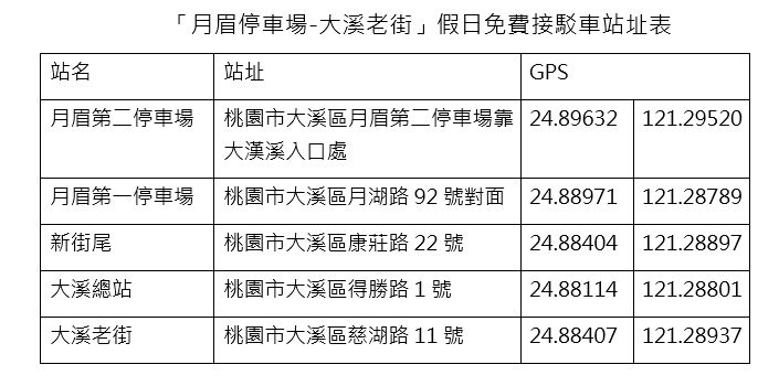 交通局提醒,此次接駁車為循環線,往程月眉第二停車場發車至大溪老街終點站後直接返程,提供免費接駁服務,民眾皆可於指定站位等候搭乘。