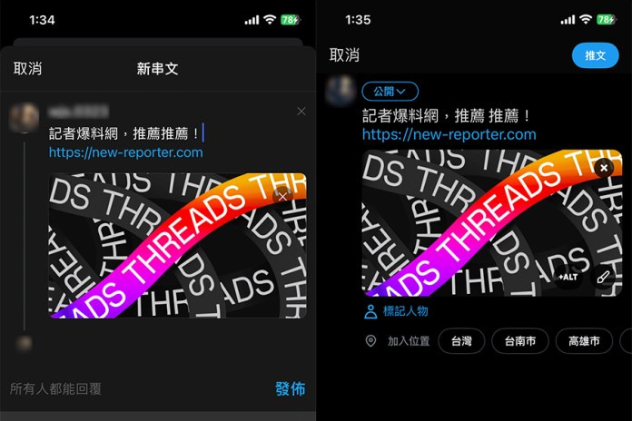 ▲Threads 直接透過IG登入、分享功能(合成圖/翻攝自應用程式內)Threads 串文方式