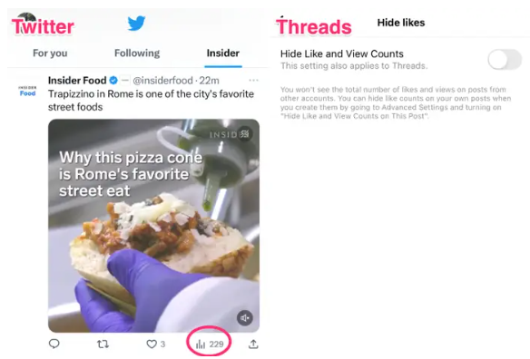 7、Threads 提供了隱藏用戶貼文贊數的選項,但在 Threads 上隱藏點贊數也會隱藏用戶 Instagram 個人資料上的點贊數。Threads 隱藏點贊數的選項功能似乎與馬斯克接管 Twitter 時所做的一些改變相反,最近,Twitter 在每則推文下方添加了兩個新功能:查看次數和書籤數量。