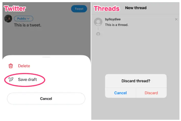 8、截至本文撰寫時,Threads 似乎沒有保存貼文草稿的選項功能,而 Twitter 支持。