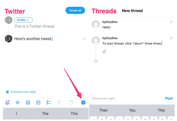 9、Twitter 和 Threads 發布串文的體驗也不一樣。在 Threads 上,用戶必須按三次 Enter 才能啟動串文,而在 Twitter 上,串文是通過加號按鈕啟動的,操作相比更友好。