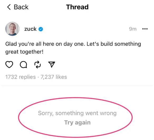 11、最後提一個小插曲,Threads 在推出後一小時內出現了一些 Bug,部分用戶報告出現無法訪問的問題。