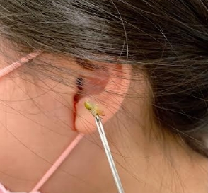 日前一名小學五年級女學童,在校期間因左耳感到異常疼痛,自覺有蟲在耳朵裡爬,遂由學校健康中心護理師陪同至聯新國際醫院就診,只見她手緊緊摀住耳朵,面露痛苦神情,直說蟲的翅膀一直在動,耳朵很痛。耳鼻喉科主任陳思齊醫師以耳鏡檢查後,發現一隻小蟋蟀在左耳耳膜上,腳爪動來動去致外耳道血肉模糊,遂隨即在外耳道噴入麻醉藥,待蟋蟀動也不動之後使用盯聹鉗取出誤入耳道的小蟋蟀,讓小女孩恢復了笑顏。