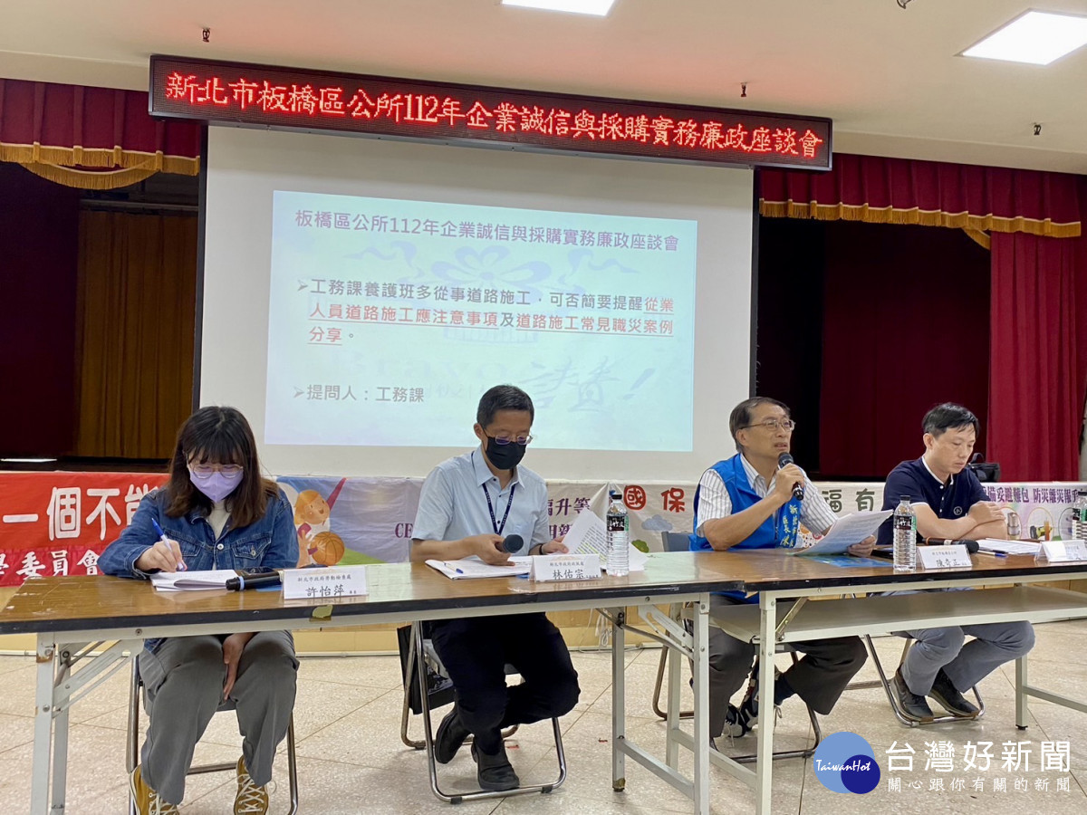 板橋區公所今(11)日與業務承辦同仁、工班人員及目前承攬公所契約54家廠商代表,於6樓禮堂舉辦「112年企業誠信與採購實務廉政座談會」,由陳奇正區長主持,並邀請新北市政風處林佑宗主任秘書、新建工程處黃宗文主任及勞動檢查處許怡萍專員擔任講座。陳奇正說,政府只有一個,透過與企業夥伴面對面交流意見,促進公私協力合作,持續推動企業誠信治理及建構優質清廉採購環境。