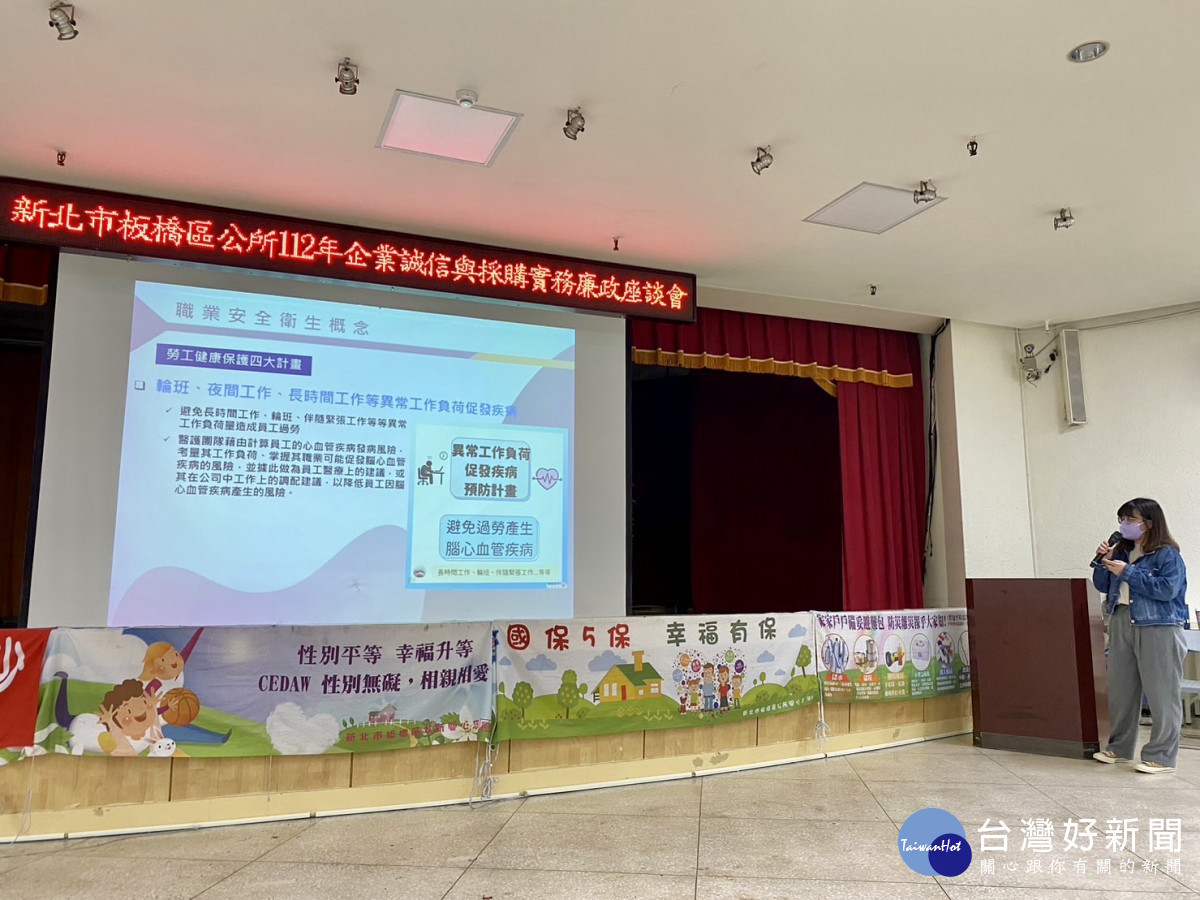 座談會由板橋區公所、新北市政風處、新建工程處及勞動檢查處合作辦理,由市府政風處林佑宗主任秘書講授「從貪瀆實例分析公務員常見法律責任–兼談遇司法強制執行之應配合注意事項」、新建工程處黃宗文主任講授「政府採購履約管理(含驗收)及爭議處理解析」,以及勞動檢查處許怡萍專員講授「職場安全衛生管理」,結合廉政法規、採購實務及職安衛管理等三大面向進行宣導和綜合座談。