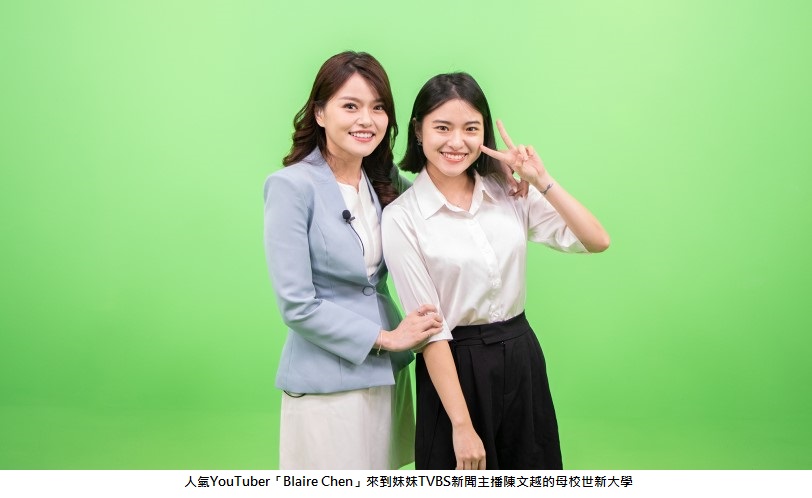 新世代女力代表、心靈保養系YouTuber、儀式感女神...種種稱號都是她,以「Blaire 左撇子」備受關注的人氣YouTuber「Blaire Chen」,目前主頻道訂閱人數達到56.8萬、總觀看次數近6千萬,擁有6部破百萬觀看影片。近年開創生活保養品牌、持續擴展影響力的Blaire,也有一位知名的新生代主播妹妹,TVBS新聞主播陳文越,10日兩人特地來到陳文越的母校世新大學,走訪校內最新的新聞攝影棚,進行了一場特別企劃,由Blaire變身新聞主播,更為妹妹母校的專業設備驚豔,力推對新聞產業有夢想的學生,一定要到世新接受完整、專業的訓練。