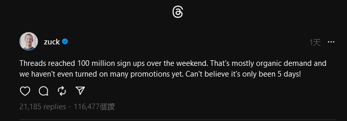 Meta執行長祖克柏11日宣布,新推出的社群平台Threads,在短短5天內註冊用戶數突破1億大關。圖片來源:翻攝自祖克柏Threads