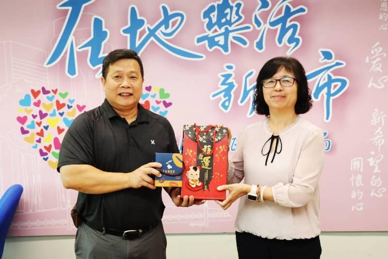 圖說:雲林縣社會處長林文志(左)特地致贈雲林名產黑豆醬油和咖啡給新北市社會局副局長許秀能。