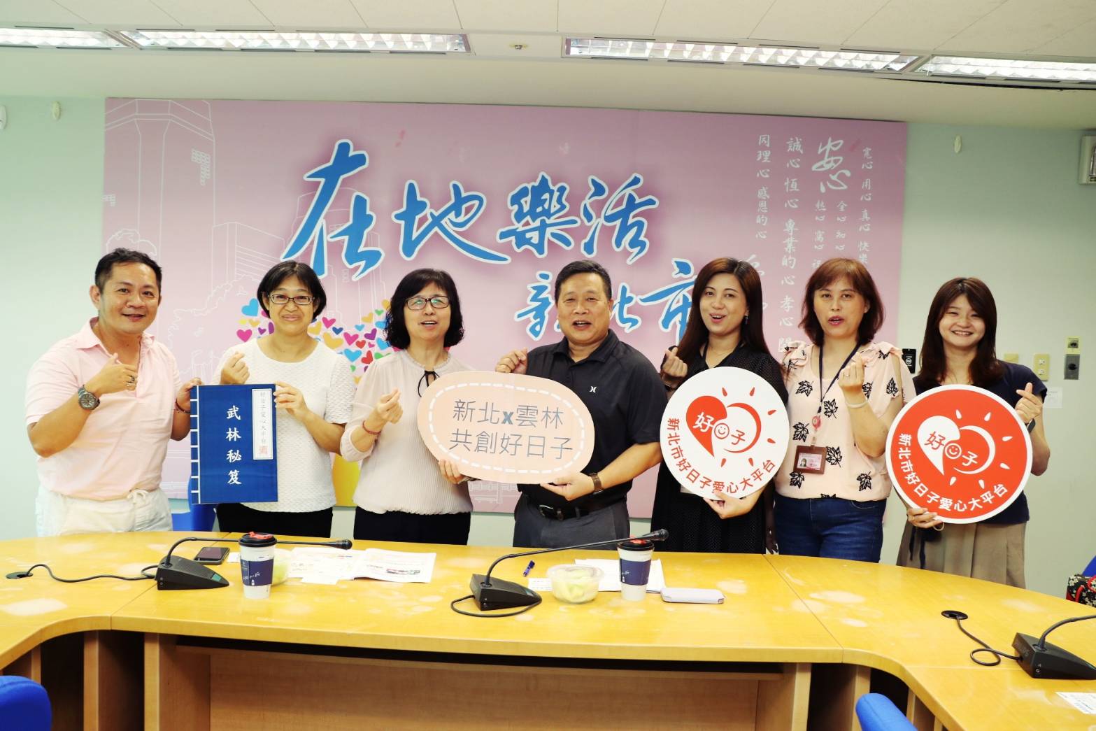 圖說:雲林縣社會處長林文志(右4)率同仁訪問新北市 新北市社會局副局長許秀能(左3)贈與好日子愛心大平台「武林秘笈」 希望創造雲林、新北共好。
