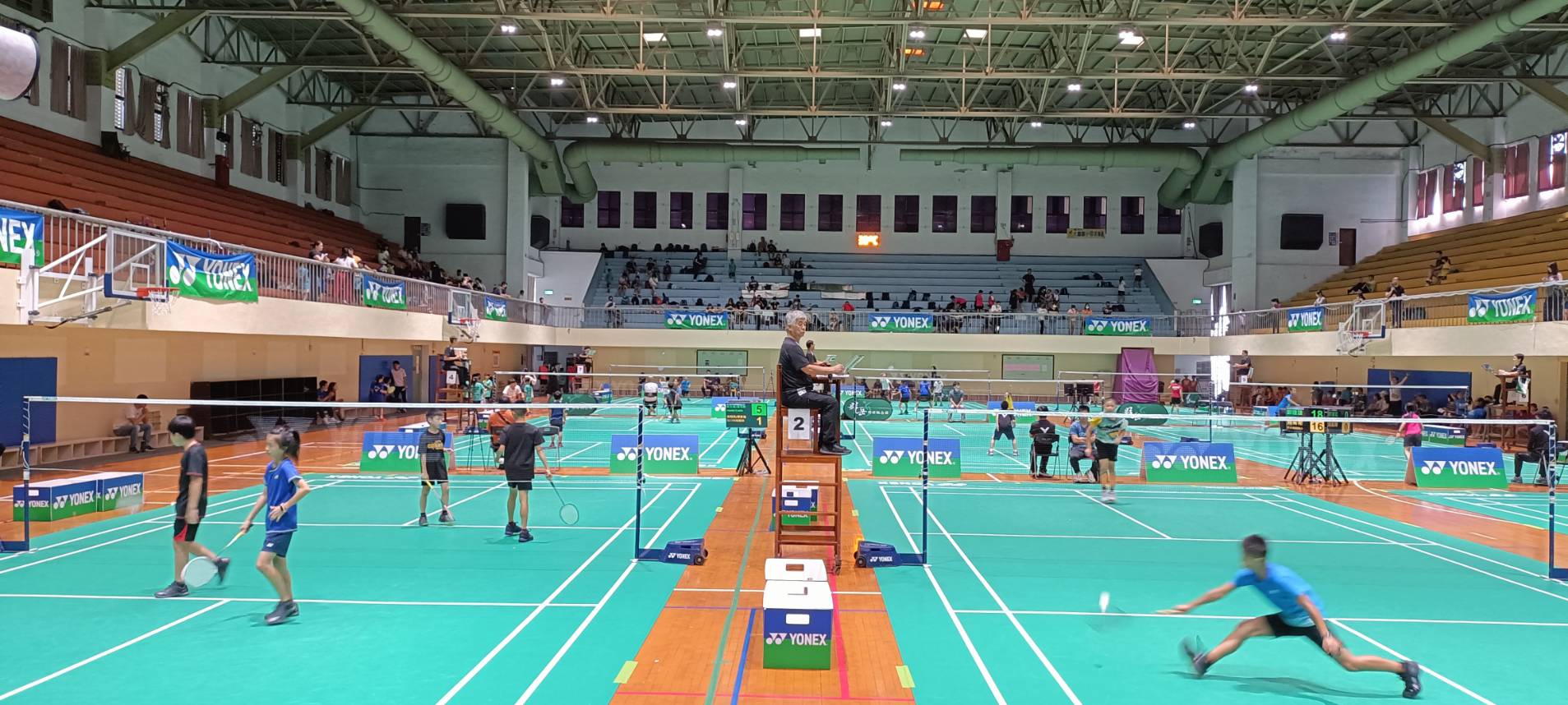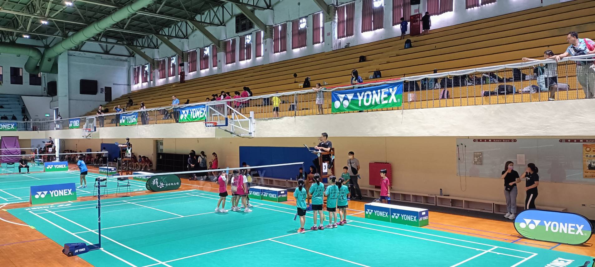 本場羽球賽感謝YONEX大力支持,賽事全館比照全國大型賽事,採用YONEX全新比賽規格專用地墊,也擺放羽球賽專用大型置物箱,裁判椅等讓場上的選手能立即感受,並享受到標準賽事的場地,感謝YONEX對賽事的用心!更感謝興大附農軟網隊,協助場地佈置與地墊鋪設,真的非常辛苦!