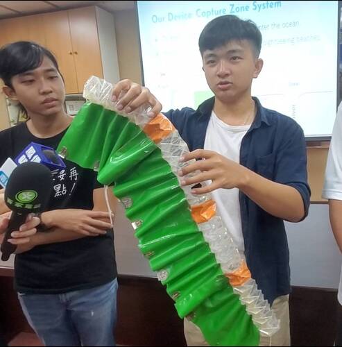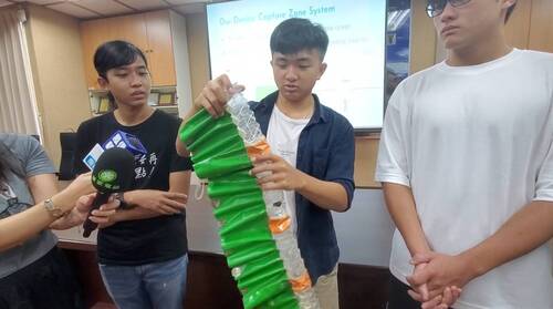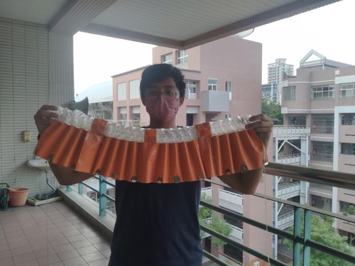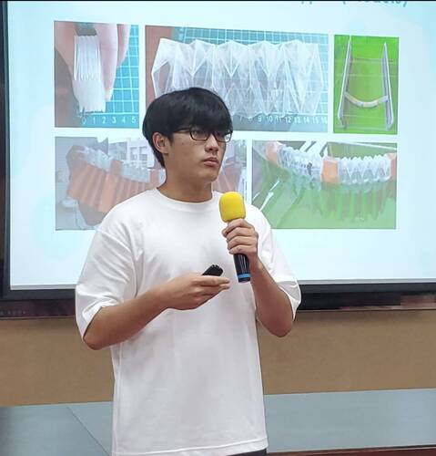 謝京霖也強調,整套裝置都是浮筒的情況下,還可以收縮,如此的設計又與汽球不同,汽球的話還需要幫浦去幫他打氣,但是整套裝置是用摺紙結構,只需要兩端有通風孔,直接拉開就可以展開,再把通氣孔堵住,就不會進水。同時,也設計製作成很多的分段與隔場,就算其中一段破損,也不會導致整套裝置沈沒。