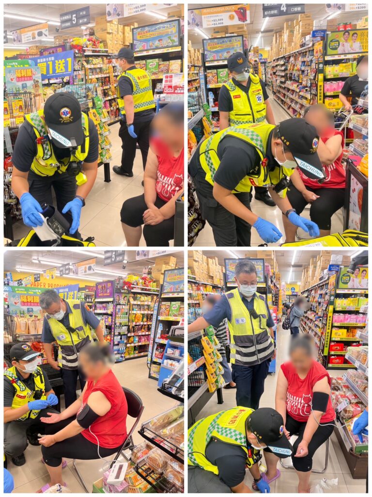 豐原警分局神岡分駐所警員吳明揚、譚士瑋於7月20日下午7時許接獲賣場店員報案,稱店內有民眾不明原因昏倒在地,需要警方協助。員警到場查看,見該名廖姓婦人(52年次)臉色慘白,且渾身冷汗直流十分難受,雖廖婦表示僅突感頭暈目眩站不穩並無大礙,但警方為安全起見,仍立即通知119救護人員到場。 經救護人員現場檢測,廖婦血壓值超標,血糖值也居高不下,在警消進一步追問之下,廖婦才坦承自己有多年的三高病史,購物時不知為何突然發作,才感到體力不支,起初廖婦堅持已是老毛病,自行返家休息即可,但警方見其氣色不佳,為免其返家有安全疑慮,仍建議前往醫院做進一步檢查,在眾人不斷勸說下,婦人才應允搭乘救護車就醫診治。 豐原分局長劉其賢呼籲,民眾出門在外若察覺身體有異狀,應儘速向附近民眾或撥打119及110求助,也可就近至安全處所休息,待身體恢復,切勿逞強,避免突然昏厥時造成二度傷害。