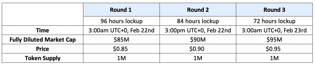 總供給量的 4% 將透過去中心化交易所 Balancer 的 LBP 池進行認購。在 LBP 的機制之下,若代幣無人認購,幣價會隨著時間下跌,因此一開池就認購對用戶而言未必是好事,但具體情況仍須市場熱度決定,若認購需求大,代幣價格仍有可能會不斷上漲。此輪將於台灣時間 2 月 23 日晚上 11 點啟動,並持續 36 小時。另外需要注意的是,LBP 拍賣輪僅能使用 USDC 認購。