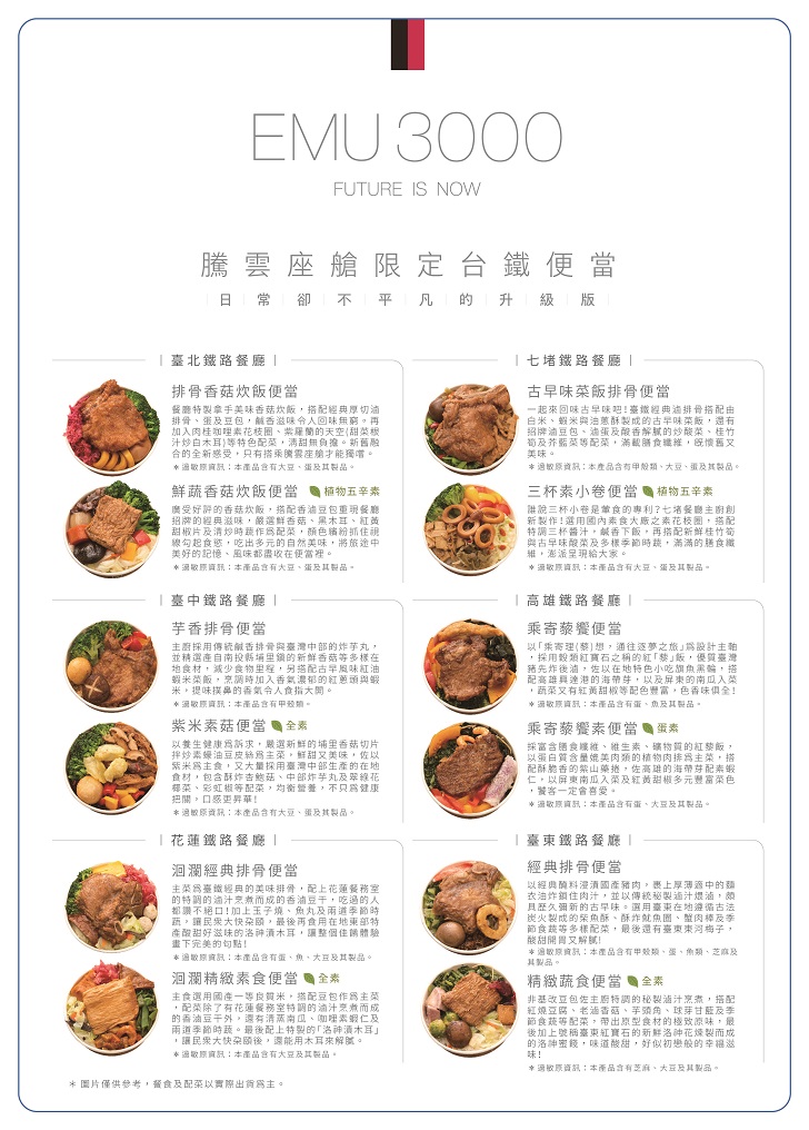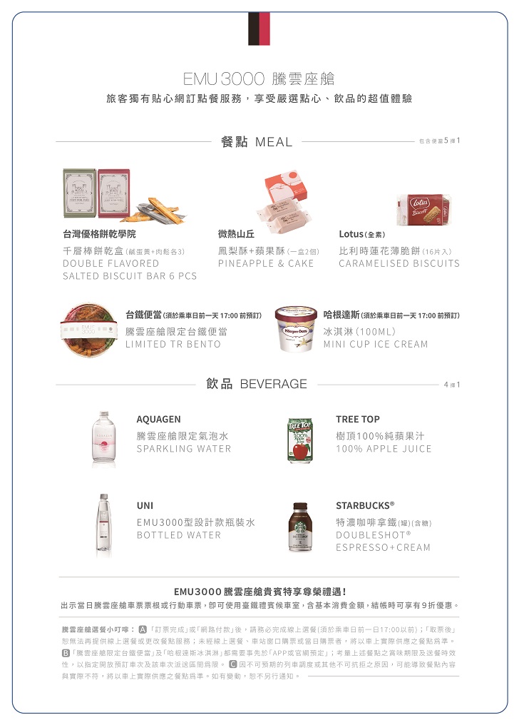 【記者 高鐿玲/台北 報導】為進一步提升服務品質,臺鐵局自今(112)年9月1日起調整EMU3000型騰雲座艙餐點換新菜色,以滿足老少咸宜的口味需求。騰雲座艙新餐點(5擇1)包含台灣優格餅乾學院「千層棒餅乾盒」(肉鬆+鹹蛋黃口味各3個))、微熱山丘(鳳梨酥+蘋果酥各1個)、比利時蓮花脆餅(全素)、騰雲座艙限定台鐵便當或哈根達斯冰淇淋;飲品(4擇1)則包含騰雲座艙限定AQUAGEN氣泡水、EMU3000型設計款瓶裝水、樹頂蘋果汁或星巴克特濃咖啡拿鐵多樣化選擇,能滿足每位旅客不同的喜好。