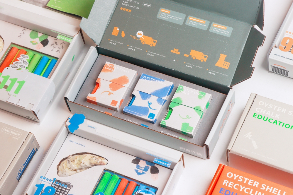至於中國科技大學視傳系學生獲得品牌設計類「紅點獎」的《蚵殼可課》作品,係由黃榮順、王曉今老師帶領廖梓妘、徐愷昱、馮楷文、游家玟、蔡依潔同學,深入探訪雲林台西、嘉義東石、台南七股等牡蠣產地,發現蚵殼廢棄問題並以設計提出牡蠣殼回收的教育計劃。