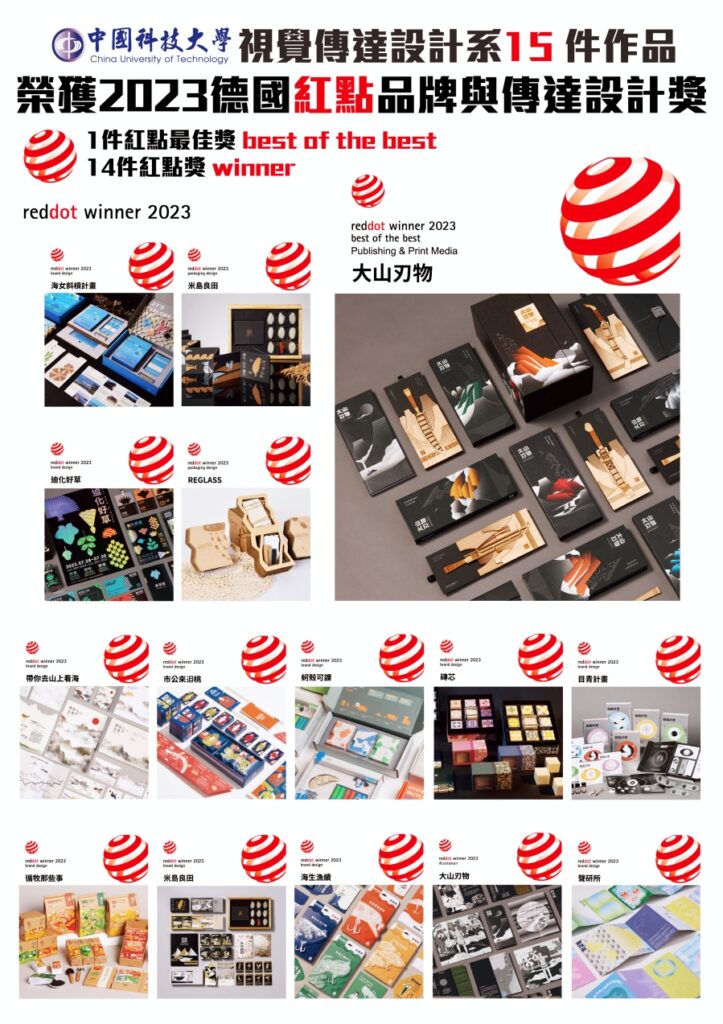 中國科技大學視傳系學生今(2023)年在全球四大指標國際設計競賽的德國紅點設計獎(Reddot Design Award)榮獲「最佳獎」(Best of the Best) 1座及「紅點獎」(Winner) 14座的肯定,實屬不易,獎項類別含括出版、插畫、包裝、品牌設計等項目,充分體現學生在視覺傳達設計專業上的實力。