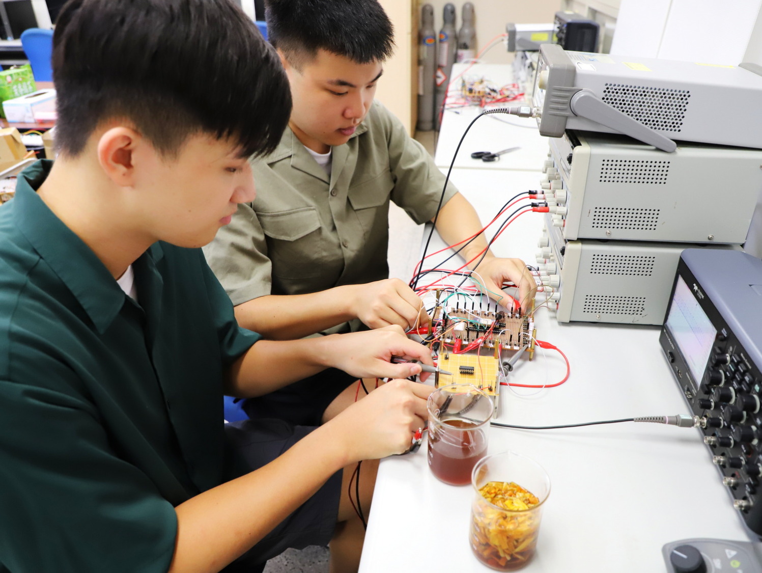 嘉大電機系楊書桓同學與吳翊誠同學表示,目前有很多種可以測量食物中二氧化硫的方法,例如:伏安法、比色法、HPLC及熒光法等,為能夠快速且方便得知金針花中二氧化硫的濃度,採用反應時間短、對儀器要求不高及操作簡單的「滴定法」進行研發,利用金針花泡水後所得到的溶液連接至轉換晶片,因導電度而產生電阻變化的二氧化硫濃度偵測器,可適用於各種不同的濃度,利用晶片的週期輸出,從而得知金針花中二氧化硫的濃度,二氧化硫濃度偵測器有別於其他種類的偵測方式,成本相對較低且速度較快。