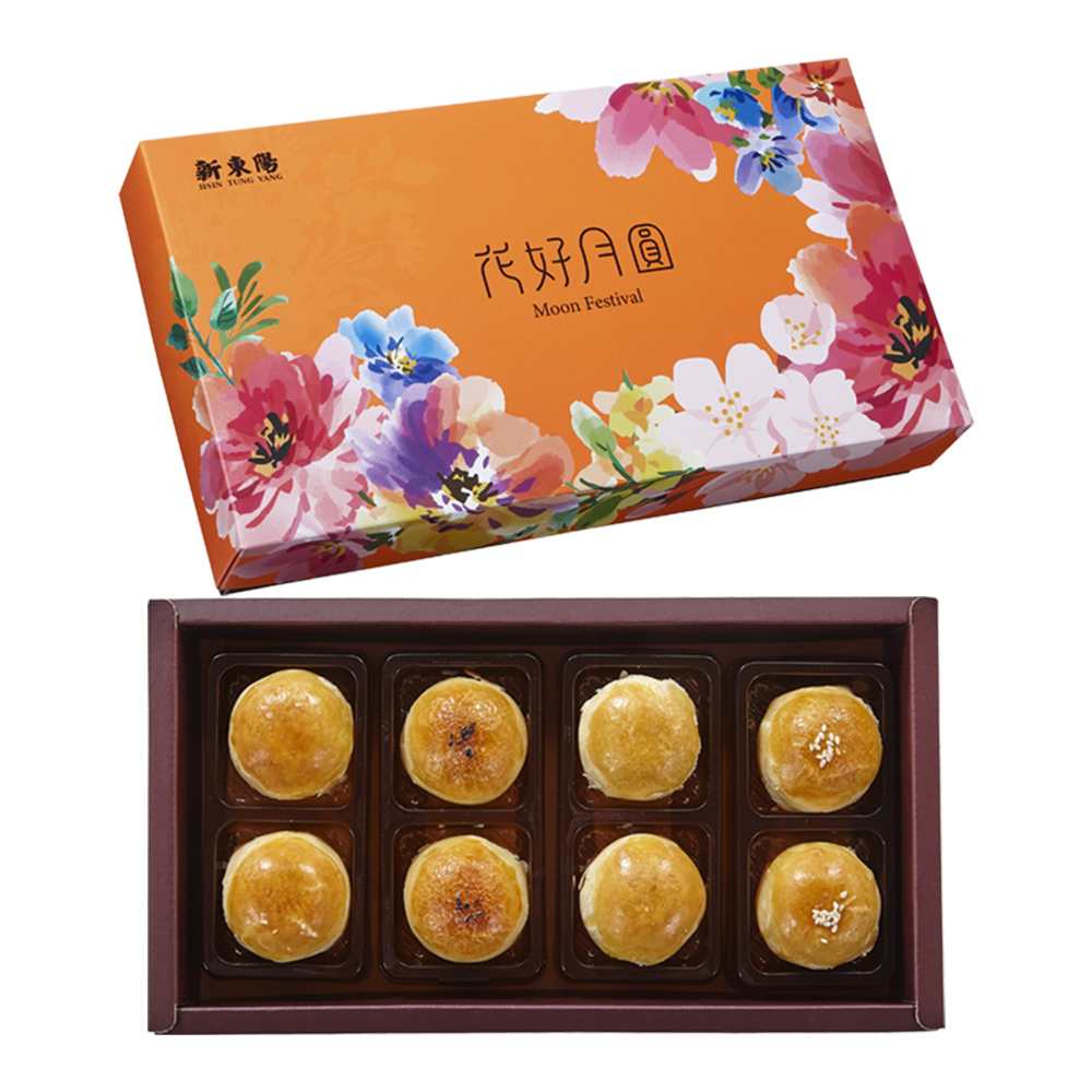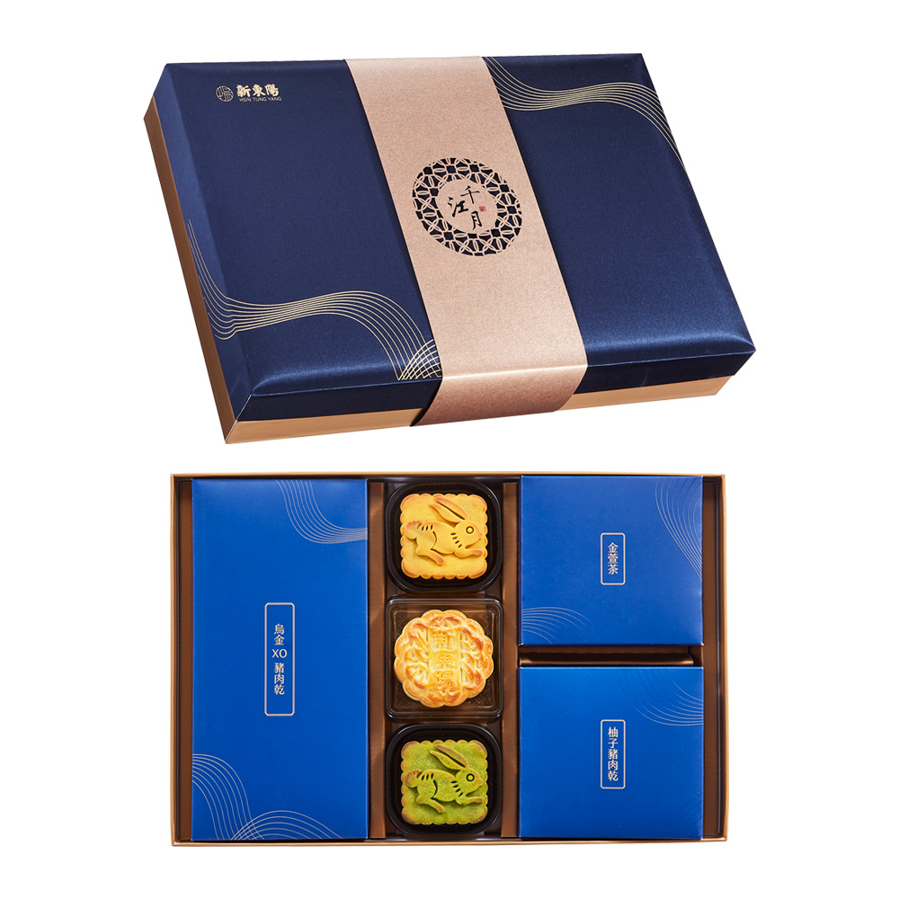 新東陽廣式月餅傳承正宗廣式糕餅製作經驗與技術已有四十餘年,皮薄餡多、口感綿密細滑、甜而不膩。口味也非常多元,有經典不敗的豆沙蛋黃、濃濃的果仁及火腿滋味的伍仁金腿、蓮蓉清香滑嫩佐以松子的香濃氣味的松子白玉蓮蓉等。除了經典廣式月餅,今年依舊延續前兩年廣受好評的月餅配茶葉的禮盒,且更升級加入兩款新東陽豬肉乾,推出優質"肉乾X月餅X台灣茶"豐富多元組合的「千江月禮盒2號」,內容包含秋節限定款柚子豬肉乾與柚香檸檬桃山月餅,清爽美味,搭配台灣獲獎金萱好茶與日式焙茶桃山月餅,茶韻回味又解膩,讓您送禮自用兩相宜!