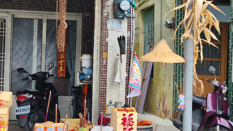 農曆7月,走進嘉義縣東石鄉的沿海村落,街道上呈現一股奇特的氛圍,家家戶戶門口前都掛著一個紅色的燈箱,旁邊還插上竹子和芝麻的枝條,甚至綁上金紙,而這些東西都是給好兄弟用的。