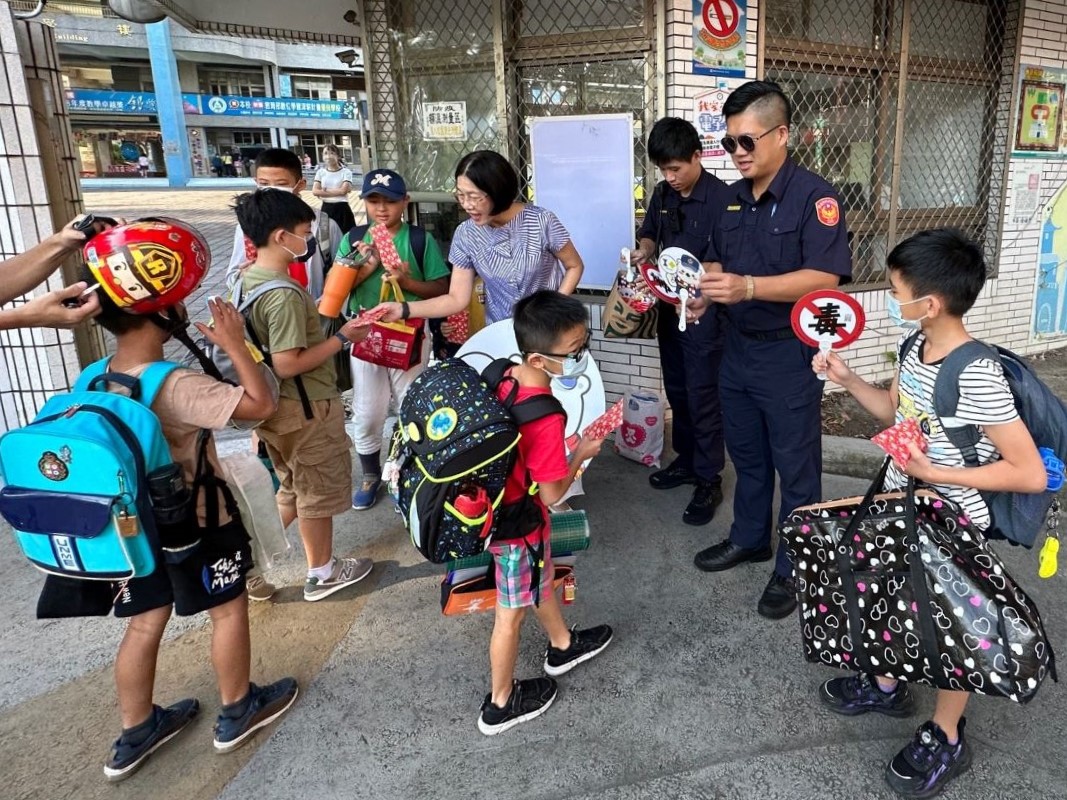 本次開學首日,警方編排勤務保護學生上、下學安全,除針對有無危害學童安全危險因子及風險,加以綜合評估,適時向學校反映並疏導校園周邊交通秩序,此外南門所長黃涵成帶領同仁會同民族國小校長等人在現場發送小白熊扇子及文具等精美宣導品,藉由開學日當天向家長及學童宣導近期詐騙手法類型及反毒等其他犯罪預防觀念,使民眾能接收更多反詐騙資訊,提高民眾「識詐、反毒」知能,進而免於受騙,守護自身財產、健康安全。