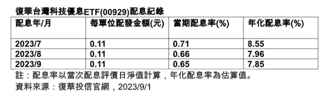 台股月配息ETF:復華台灣科技優息(00929),第三次月配息出爐!復華投信官網收益分配期前公告,00929每受益權單位預估配發0.11元,是連續三個月配息0.11元。以評價日8月31日淨值16.81元計算,預估這次現金殖利率約0.65%、年化殖利率約7.85%。