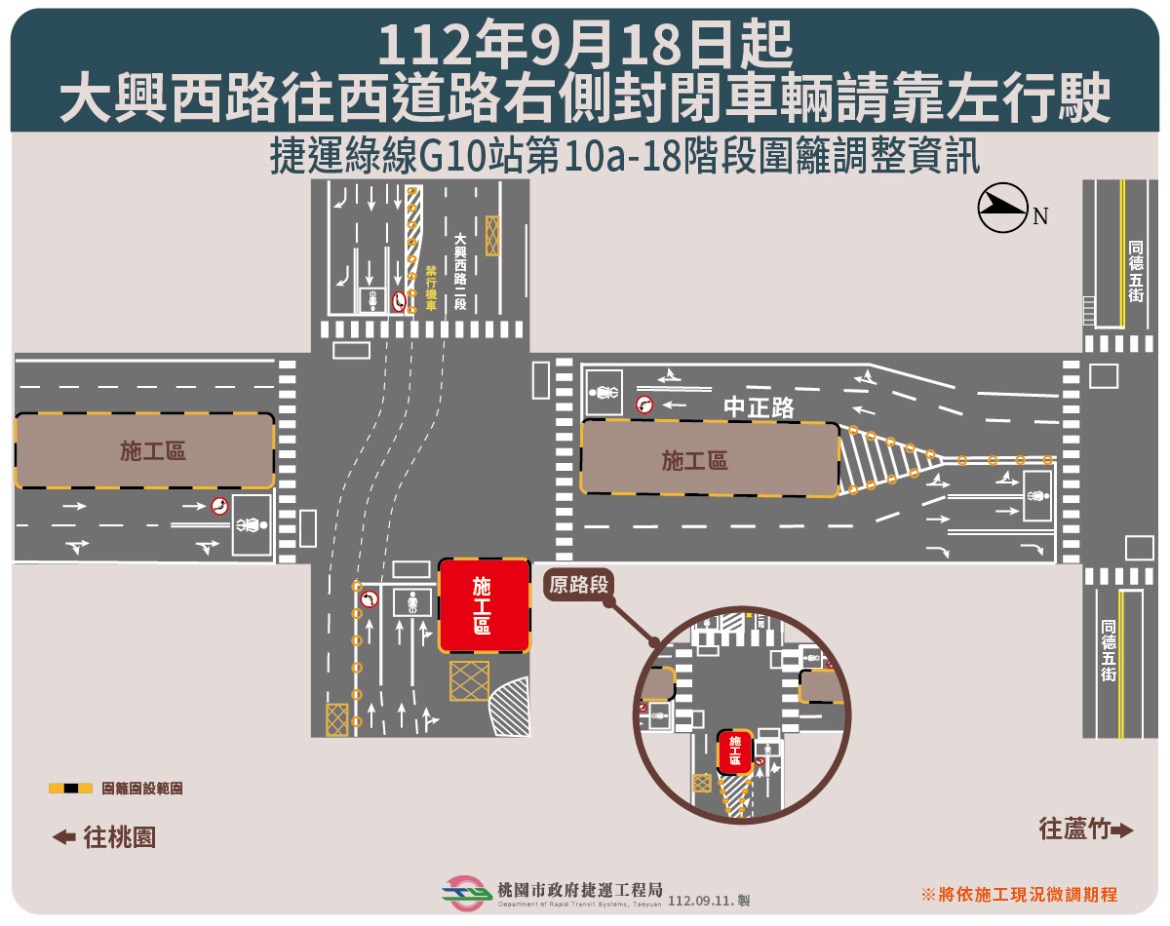為配合桃園捷運綠線開挖施工,桃園市捷運工程局將自9月18日起,進行桃園區中正路大興西路口捷運施工範圍調整,大興西路往西道路右側封閉,車輛請靠左側行駛,施工期間維持南北雙向各兩個車道通行。捷工局呼籲行經施工區域駕駛人禮讓行人小心慢行。