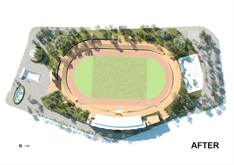 侯尊堯期許中正運動場改造,讓運動場不只是競賽場地,更是居民享受生活與創造回憶的景點,並以開放空間的設計梳理周遭交通節點,透過運動場的機能帶動捷運的使用並創造站點特色,將改造後的運動場作為高雄市的新生活地標。(圖/運動發展局 提供示意圖)