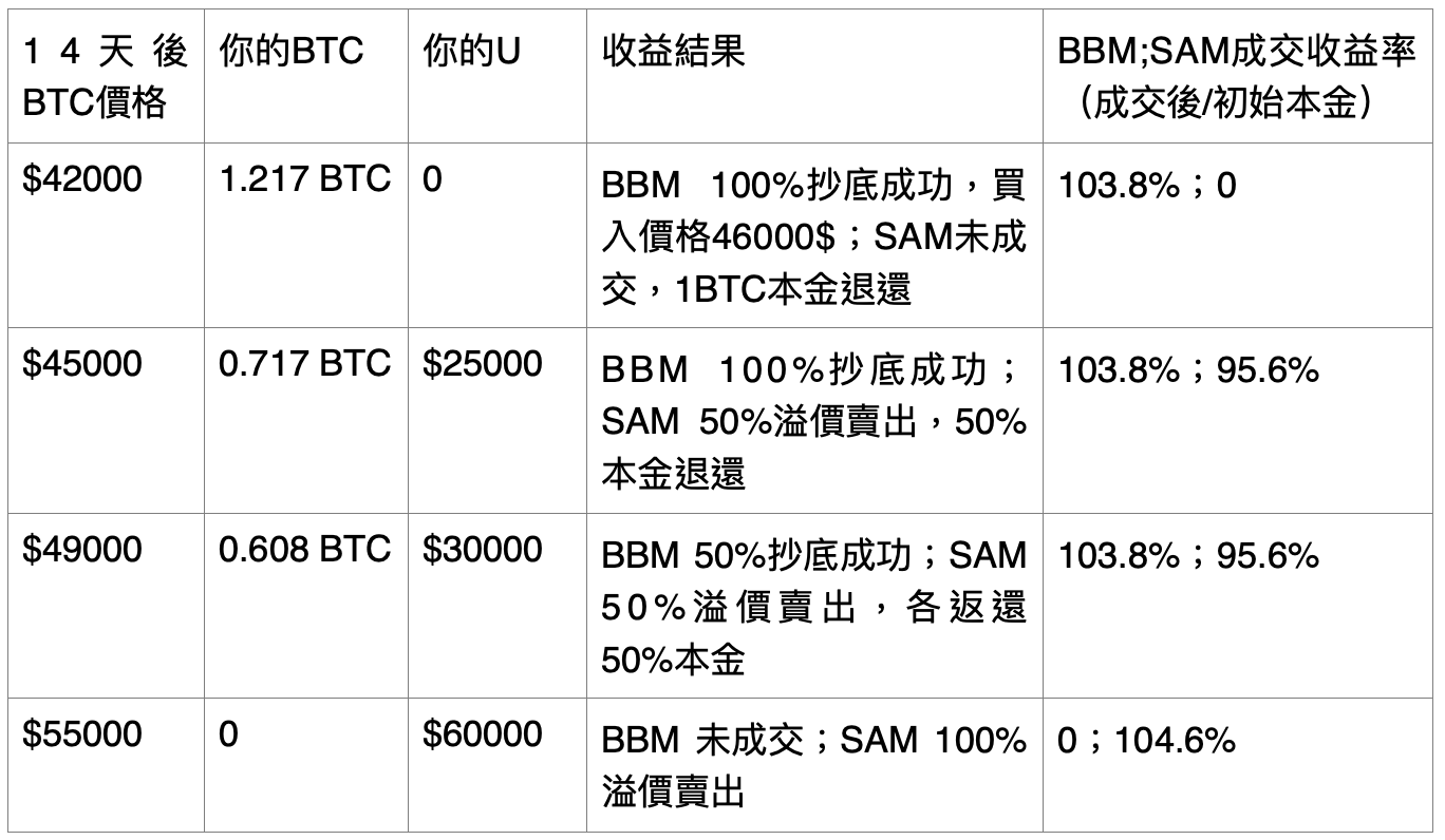 本場景很好理解。如果在一定時期內略看漲 BTC,投資 BBM 可以幫助用戶在短期內鎖定買入幣價,賺取折價利潤;如果在一定時期內略看跌 BTC ,投資 SAM 可以幫助用戶在短期內鎖定賣出幣價,賺取溢價利潤。