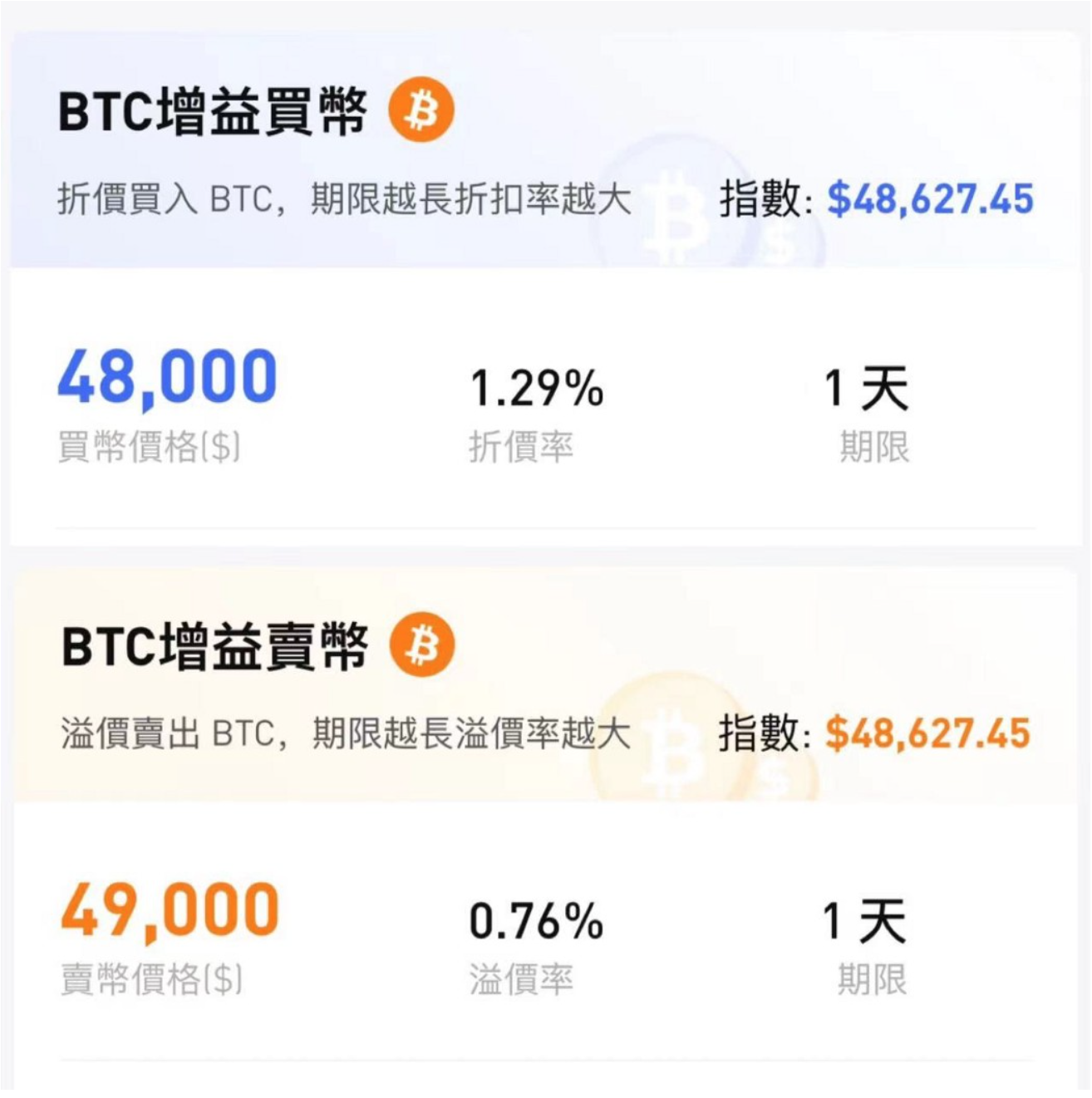 增益買幣 (buy below market,簡稱 BBM):在一定時間內,用戶有機會以低於 BTC 現貨市場的價格,買入不同比例的 BTC;增益賣幣 (sell above market,簡稱 SAM):在一定時間內,用戶有機會以高於 BTC 現貨市場的價格,賣出不同比例的BTC。