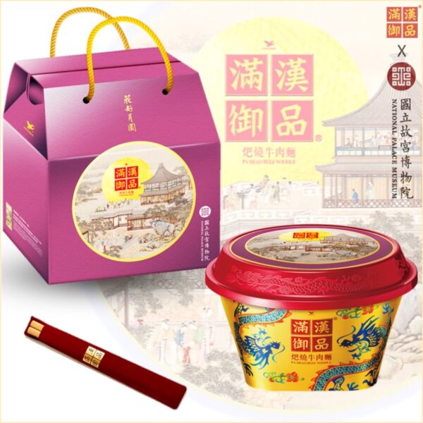 中秋限量版「滿漢御品」,禮盒主色採用「帝王紫」還原乾隆紫袍色彩呈現尊貴、祥瑞意涵;並將金色滿月入畫,運用金色細沙質感模擬出滿月美景,讓禮盒放在家中即可賞月,營造出『花好月圓、御品珍寶』古今中外一起歡慶中秋的概念,將中華飲食文化代表-牛肉麵,與故宮的極致典雅美學完美結合,彰顯出送禮的不凡品味。此外更貼心附贈金檀筷組(附金標麂皮套),處處感受有如皇家御用尊榮感,絕對是今年中秋送禮品味獨到的選擇啊~!