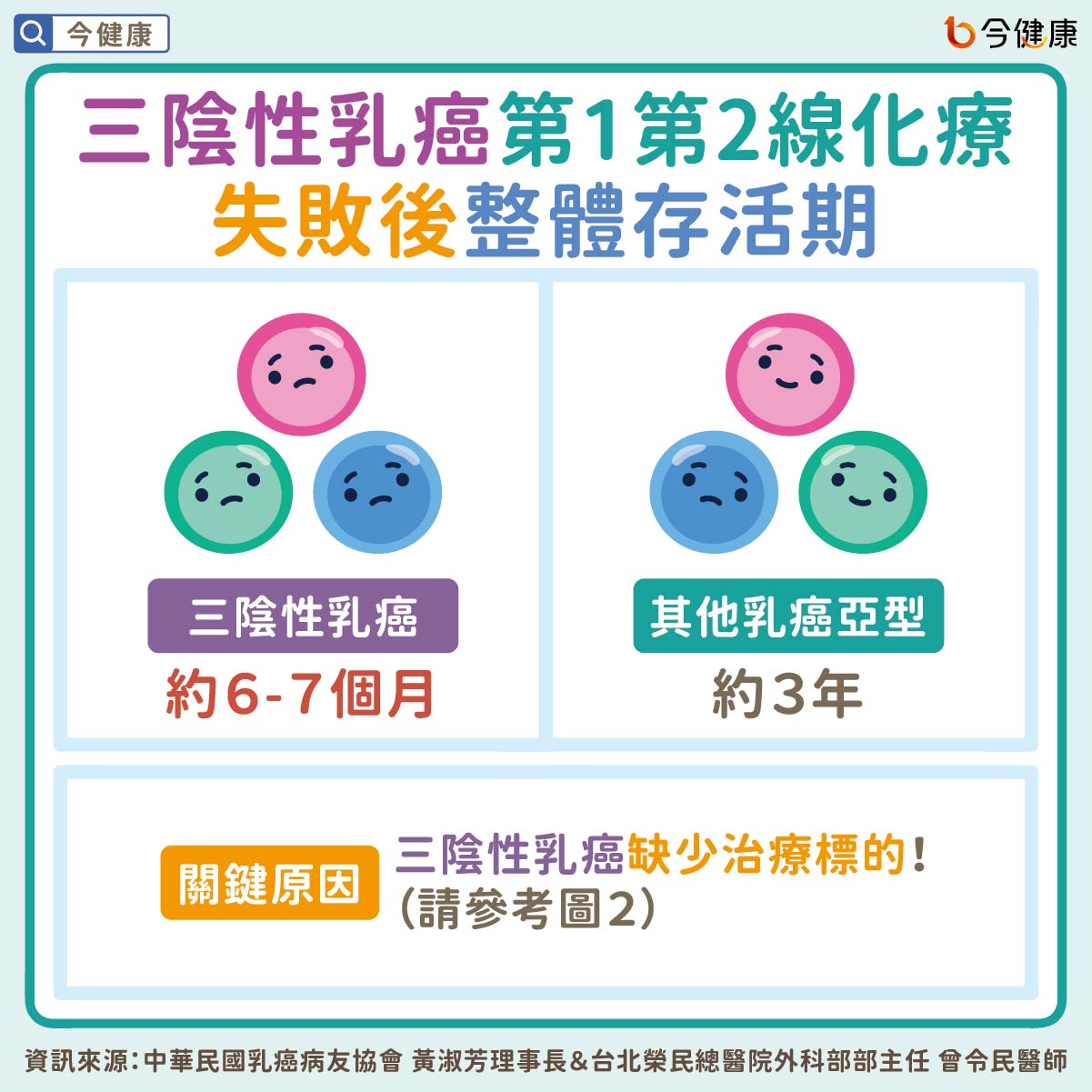 台北榮民總醫院外科部部主任曾令民醫師分享,臨床研究數據顯示轉移性三陰性乳癌在第一線與第二線化療治療失敗後,後續的化療整體存活期僅6到7個月,相比其他乳癌亞型存活期約近3年左右,唯獨轉移性三陰性乳癌預後最差,最主要的原因就是三陰性乳癌缺乏治療標的。