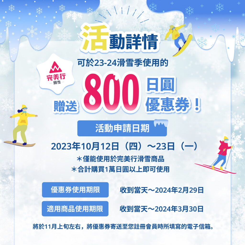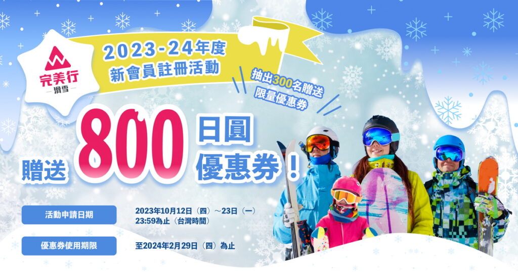 在正式進入滑雪季之前,完美行滑雪將從10月12日起推出贈獎活動,抽出300位幸運兒,贈送可於2023-2024滑雪季使用的「800日圓優惠券」。
