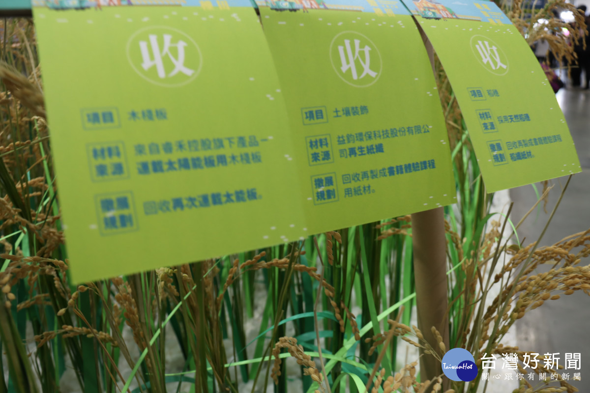 其中睿禾控股股份有限公司,經由文策院的媒合串連具有共同理念的夥伴與立體紙藝團隊半隻羊聯手,讓參觀廠商及民眾能清楚了解太陽能光電。落實展場永續理念,造景土壤更採用益鈞環科尿布分解成的再生紙纖,後續更能回收成為製作紙張及書籍的基礎用料。展場擺設部分,採用租賃代替購買,使現場設備能夠被循環運用,將永續概念徹底落實。