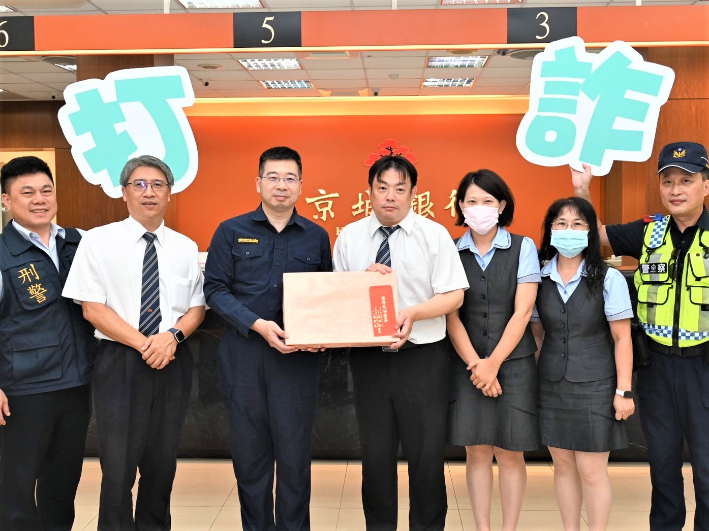 〔今傳媒/記者呂昭德報導〕嘉義市政府警察局第一分局分局長林詔徹於10/16日率隊至轄內京城銀行嘉義分行向行員關懷提問宣導時,行員在過程中提出遇到了一名客戶帳戶許久未有資金往來,卻突然前來臨櫃提領新臺幣100萬元,因平時分局密切的與銀行密切聯繫作詐騙宣導,行員也機警地察覺該筆金流有異,通報轄內長榮派出所員警前來協助查證,並暫時將該帳戶設定圈存(凍結48小時),並經一分局分局長緊急指派同仁調閱資料後發現,該筆款項係民眾遭假投資詐騙的匯款,及時聯繫被害人完成報案,在黃金48小時內成功攔阻新臺幣100萬元。