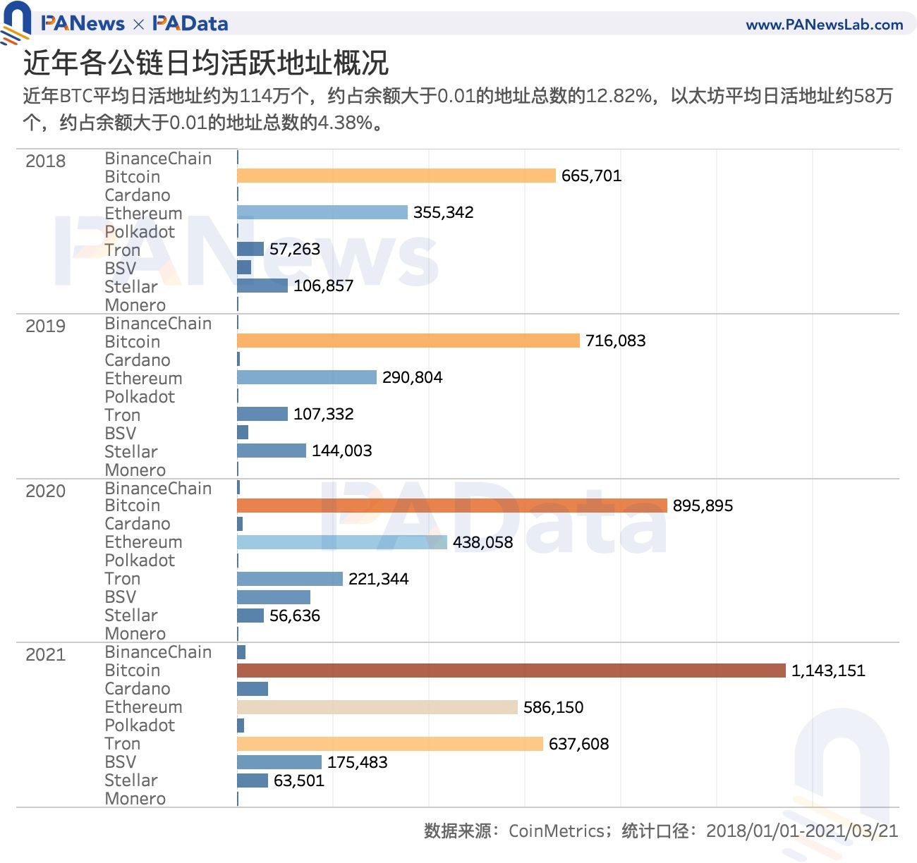 2)比特幣的日均活躍地址約為 114 萬個,佔有效地址總數(餘額大於 0.01)的 12.82%;以太坊的日均活躍地址約為 58 萬個,佔有效地址總數(餘額大於 0.01)的 4.38%。其他公鏈的日均活躍地址數大約在 5 萬至 20 萬個之間。