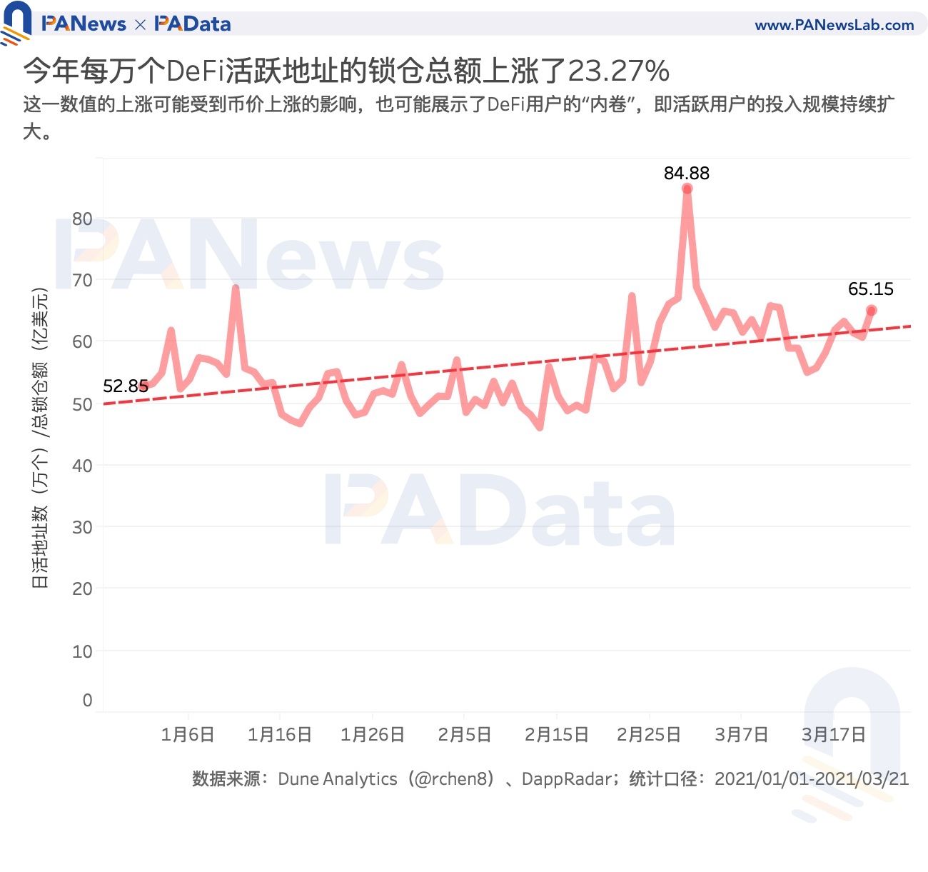 值得注意的是,今年以來,每萬個活躍地址的(校正後)鎖倉總額呈明顯上升趨勢。年初,每萬個活躍地址的(校正後)鎖倉總額約為 52.85 億美元,而 3 月 21 日,這一數字已經上漲至 65.15 億美元,漲幅達到 23.27%。這可能受到幣價上漲的影響,也可能展示了 DeFi 用戶的「內卷」,即活躍用戶的投入規模持續擴大。