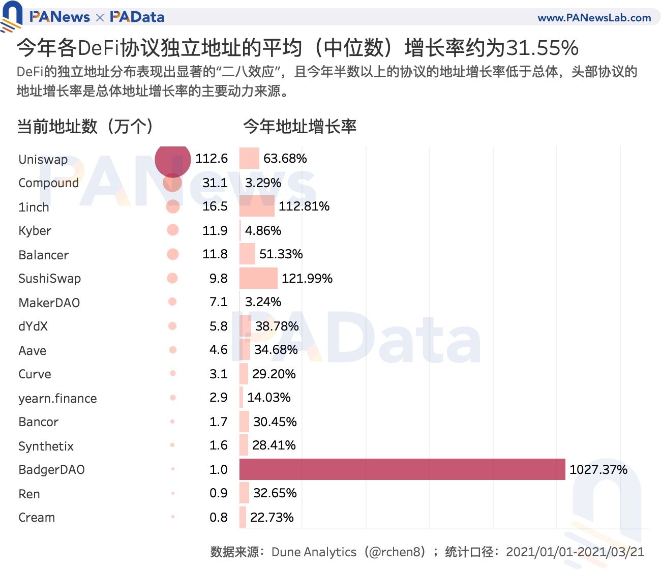 今年各 DeFi 協議獨立地址的平均(中位數)增長率約為 31.55%,低於整體 42.08% 的漲幅。其中,僅 BadgerDAO、SushiSwap、1inch、Uniswap 和 Balancer 的獨立地址漲幅超過了整體水平,尤其是 BadgerDAO,漲幅超過了 1027%,SushiSwap 和 1inch 也都超過了 100%,這三個應用的漲幅較高。可見,頭部協議的地址增長率是總獨立地址增長率的主要動力來源。