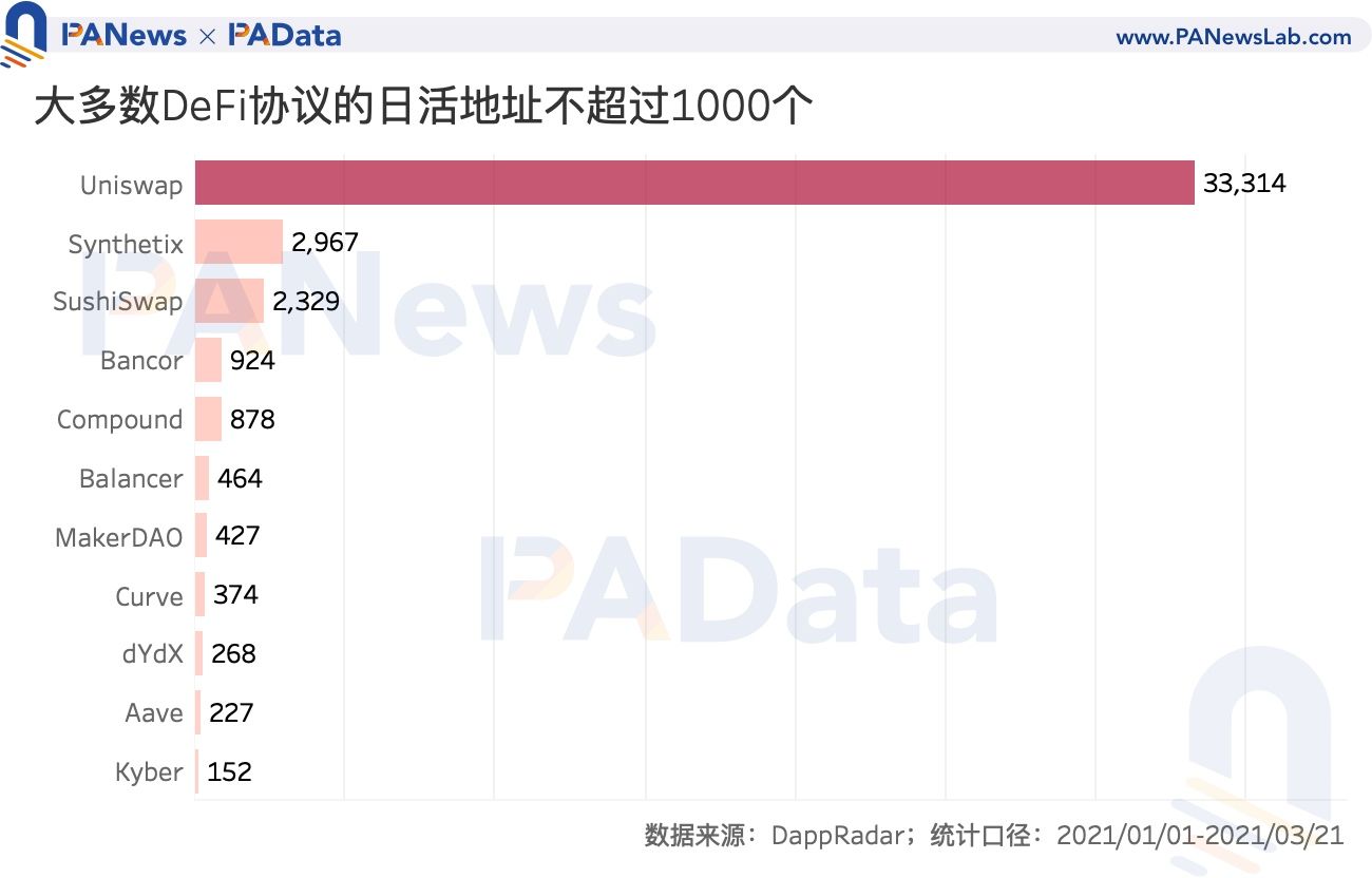 而且,根據 DappRadar 的數據,目前絕大多數 DeFi 協議的日活躍地址都很低。今年日活地址最多的 Uniswap 也僅 3.33 萬個,這與行動網路主流應用動輒上億的日活還存在非常顯著的量級差異。但應該看到各 DeFi 協議日活地址的快速增長潛能。