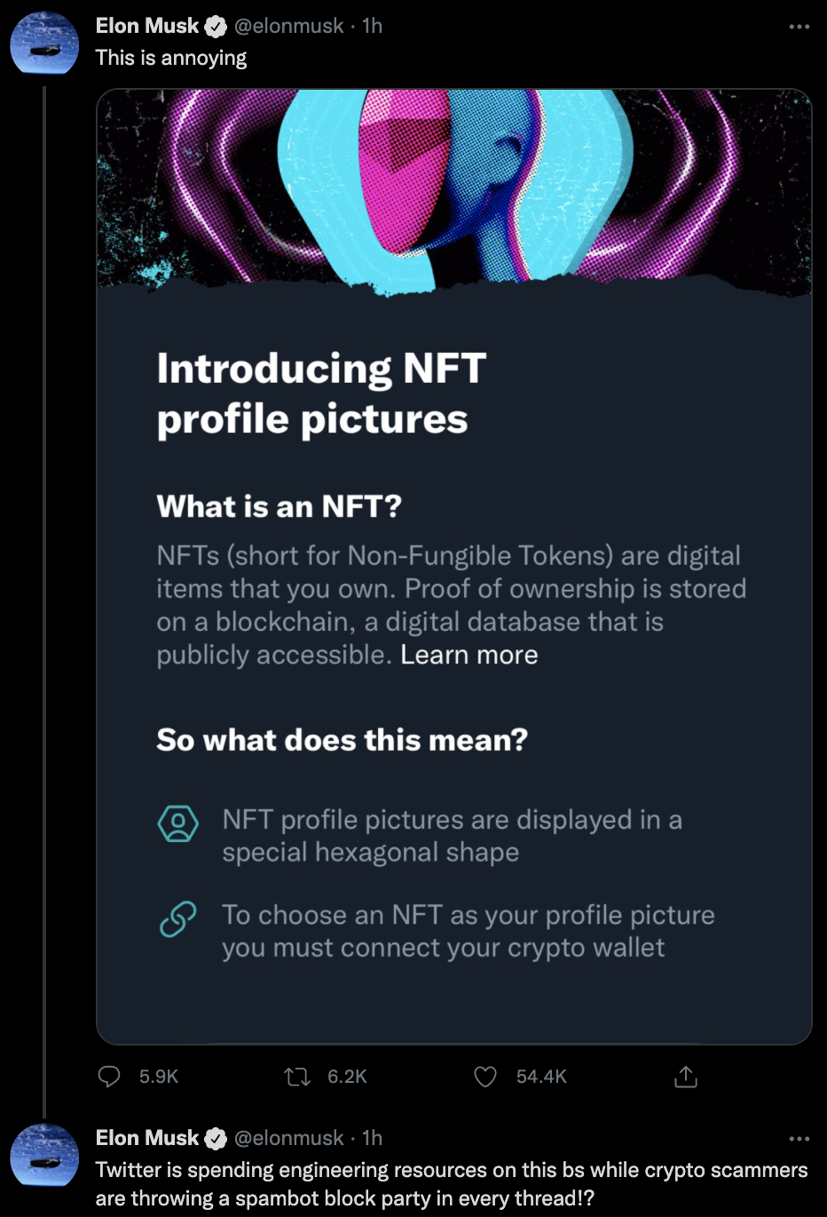 馬斯克在看到 Twitter Blue 功能介紹時,表示不耐。他抱怨 Twitter 不該把開發資源拿來做這種東西,真正該做的事情是組織那些加密貨幣圈的詐騙貼文。