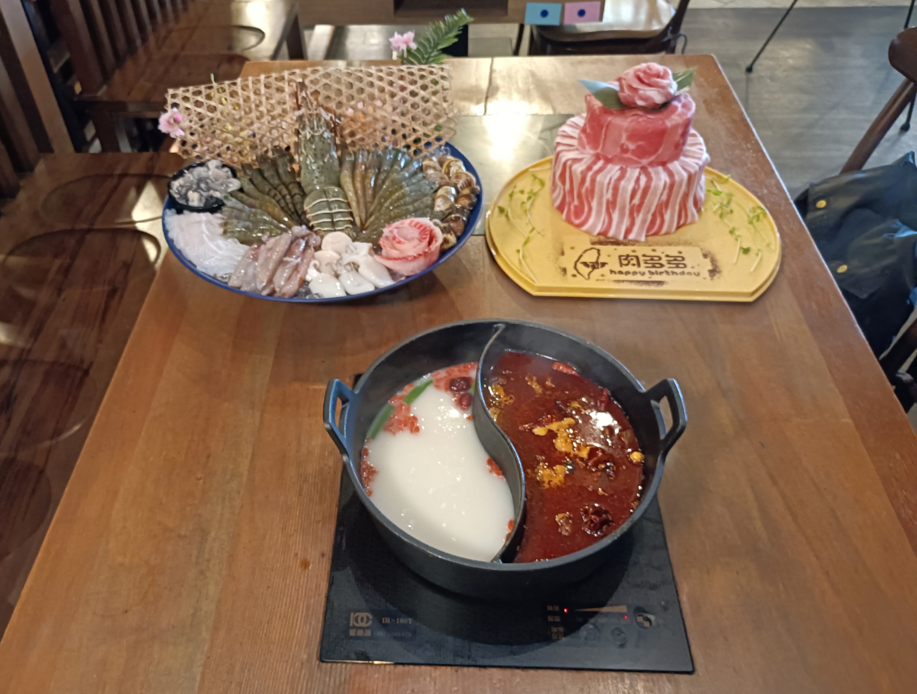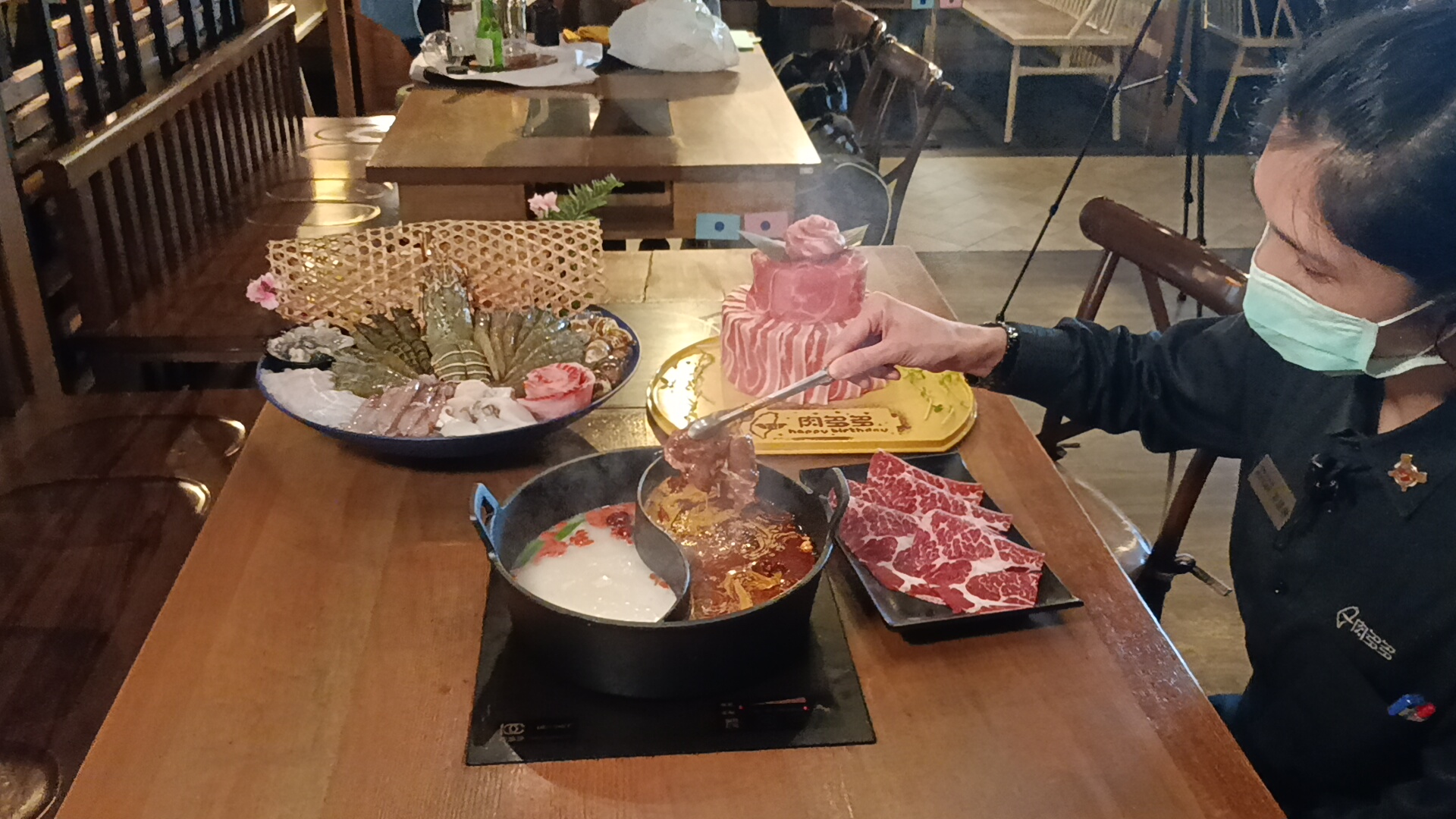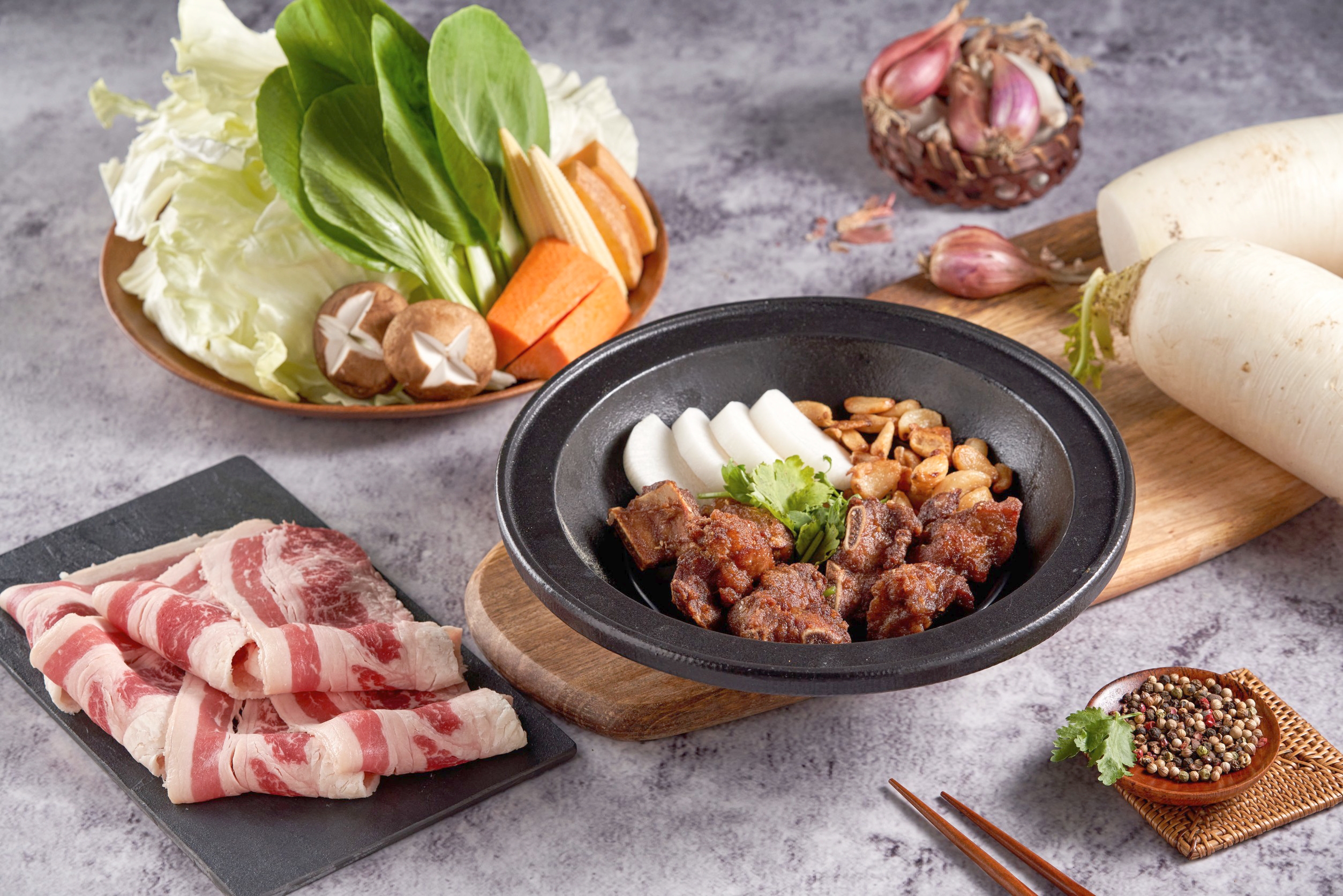 菜單中最大的亮點,是每天現炸獨家配方醃製的排骨酥,結合柴魚高湯,消費者可以根據個人喜好任意搭配牛/豬/雞肉或是海鮮。另外桌邊現炒的生炒花枝與私房酒香花雕雞也毫不馬虎,透過熱炒帶出的鍋氣與酒香,讓食材的口感更豐富多層次。套餐均附蔬食自助吧、4款精選嚼勁十足的關廟麵,飲料當然要挑最台的芭樂汁暢飲,才算是圓滿整個新台式火鍋的儀式感。