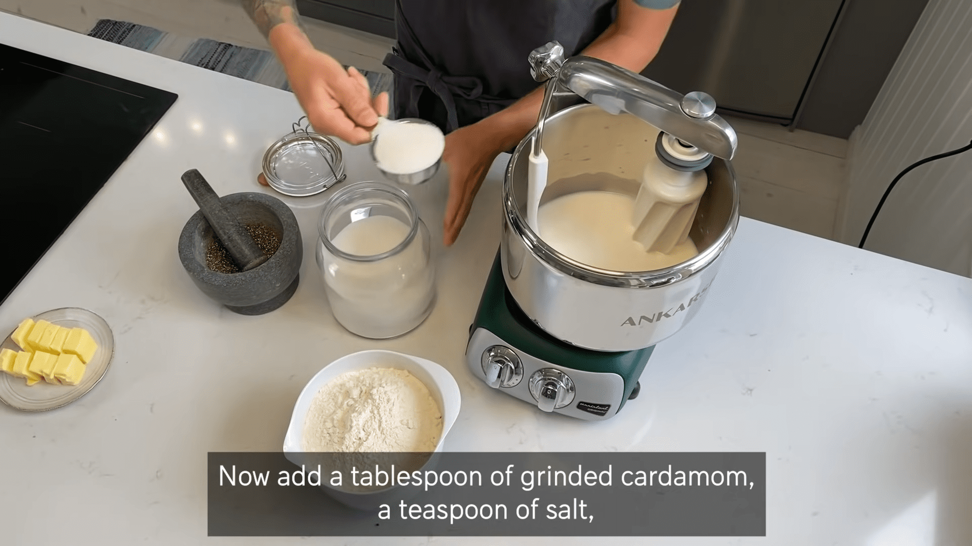 - 加入奶油、糖、鹽、小荳蔻和麵粉,將麵團放入立式攪拌機中攪拌約 10 分鐘。直至麵糰不會粘在手指上。