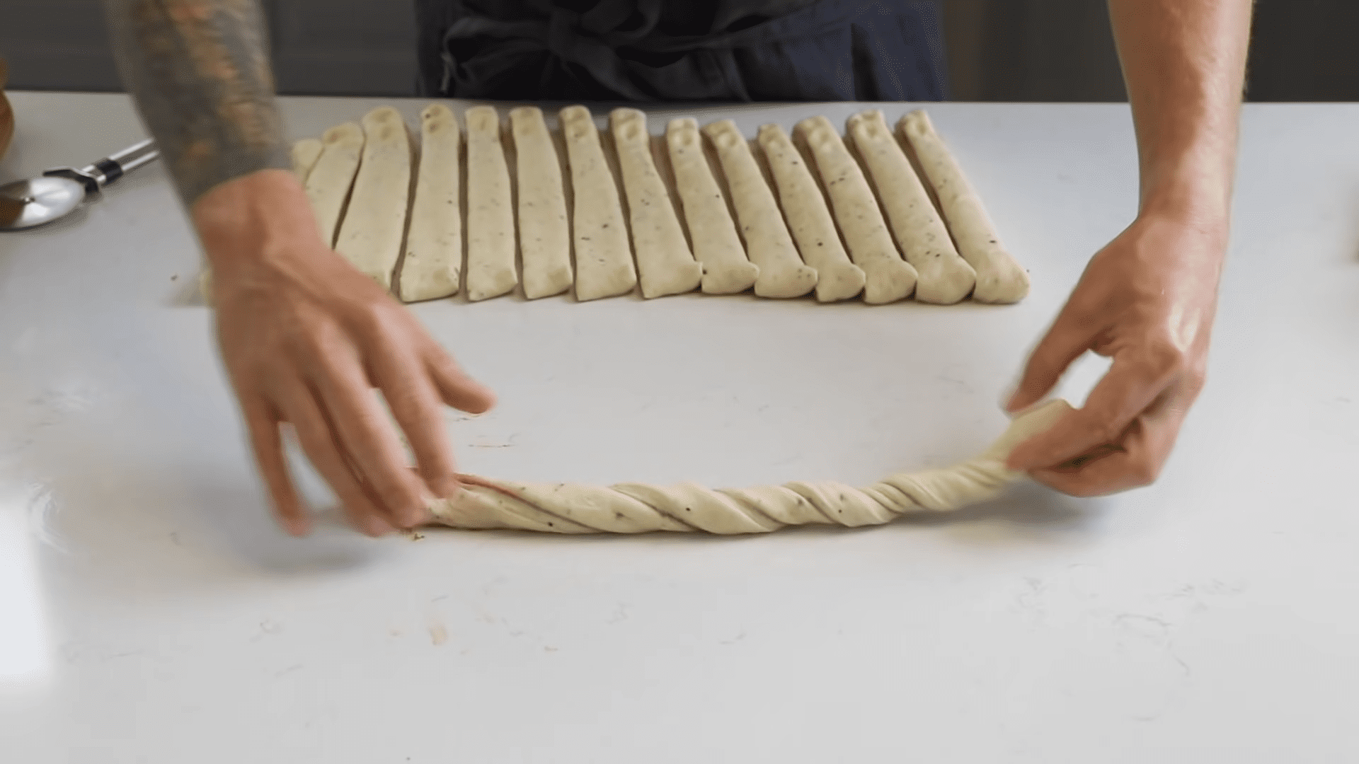 - 用披薩刀將麵團切成約 1 吋寬(2 公分)的 20 片。扭轉麵團,將其打成一個結,末端位於小圓麵包下方。