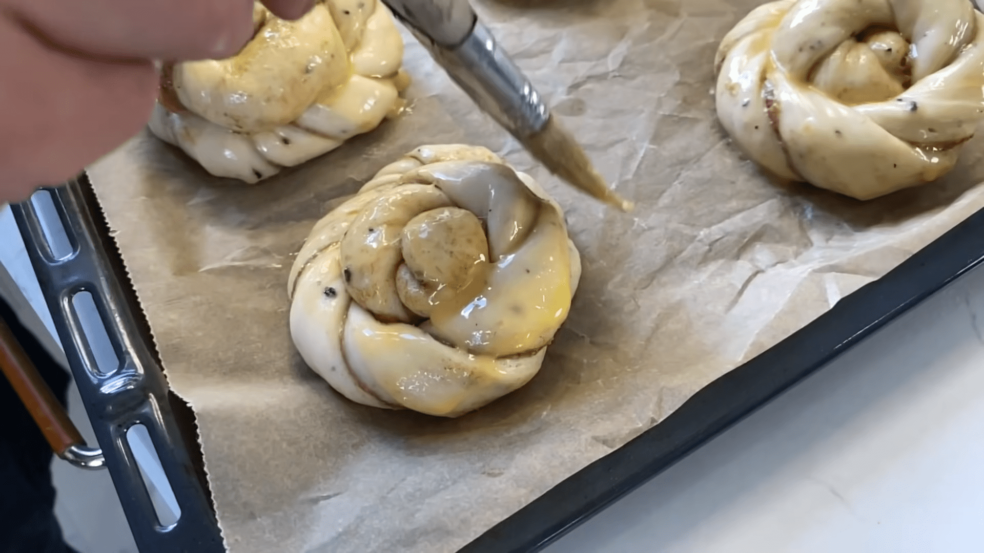 - 雞蛋打入小碗中打散,蛋液塗抹頂部,並撒上珍珠糖或粗糖。