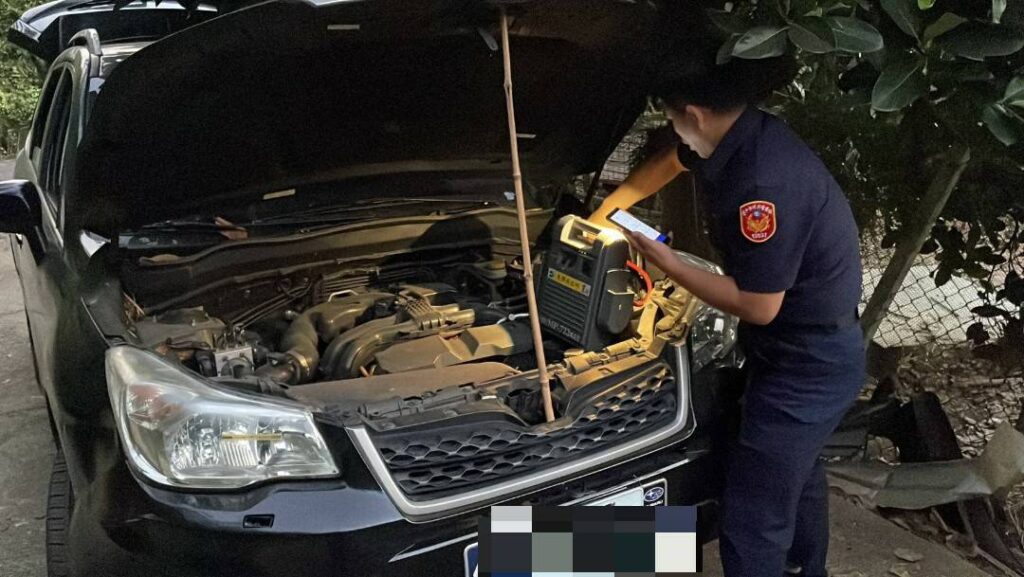 家住北區的陳姓駕駛於5日10時許,駕駛自小客貨來新社區食水嵙附近山區的果園養雞,下車時卻忘記將大燈關閉就進入果園整理、養雞,導致陳男於16時許要離開時電瓶已經沒電,車輛無法發動,適逢星期日附近汽車修配廠休息,陳男求助無門下立即撥打新社分駐所報案求助。副所長郭文達、警員李亦騏攜帶行動電霸火速前往救援,副所長郭文達以行動電霸連接車輛電池做短暫的充電後,經幾次嘗試終於順利發動車輛。陳男見車輛順利發動後,頻頻向警方道謝,表示在求助無門下,警方立即伸出援手協助解決困境十分暖心。