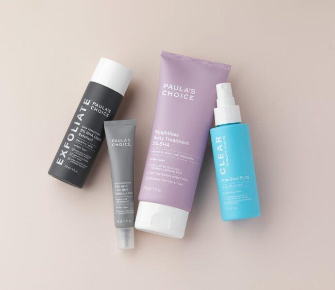 ▲寶拉珍選 2%水楊酸精華液(左1),25%果酸+2%水楊酸煥膚面膜(左2),2%水楊酸身體乳(右2),淨無痘2%水楊酸美體噴露(右1)。(圖/業者提供)