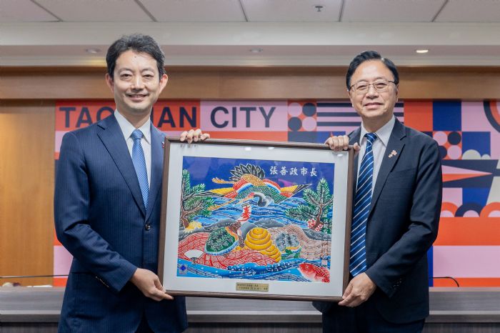 桃園市長張善政昨(13)日下午於市府,會晤日本友好城市千葉縣知事熊谷俊人等一行訪問團,張善政致贈熊谷俊人大溪木藝品「盟誼永固魯班鎖」,形狀接近千葉縣縣徽,象徵桃園與千葉堅定的友誼;熊谷俊人則回贈張善政千葉縣藍染作品,精緻多彩,祝福桃園市運昌榮。
